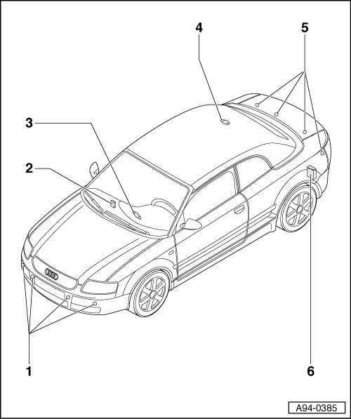 • removing and installing: for vehicles through MY 2006, refer to => [ Front Parking Aid Sensor, through MY 2006 ] Parking Aids, for vehicles from MY 2007, refer to => [ Front Parking Aid Sensor, from MY 2007 ] Parking Aids