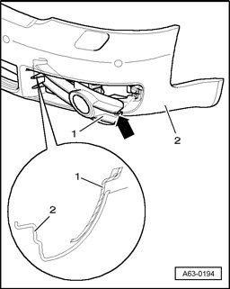 - Press air intake grille - 2 - on the inside of bumper cover - 2 - as shown toward rear out of locking mechanism.