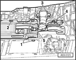 - Disconnect hose - 5 - of headlamp cleaning system on both sides (press release buttons).