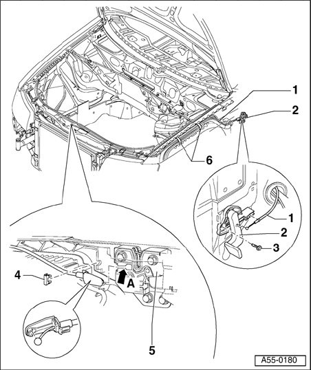 - Unclip cable for lower part of hood lock and disengage attachment lug-arrow A -.
