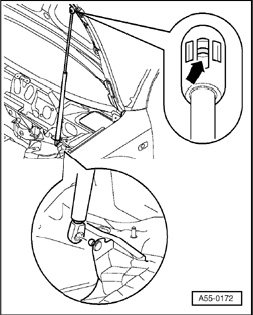 - Gently lift retaining springs-arrow-at both ends of gas-filled strut using a screwdriver and unclip gas-filled strut.