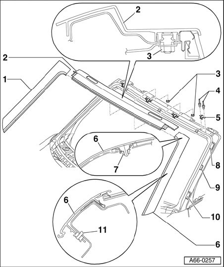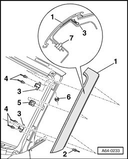 - Retaining clip - 5 - is fixed. It is secured to A-pillar with hollow rivets.