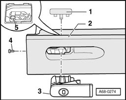 - Remove bolt - 4 - from handle - 3 - on left side of glove compartment.