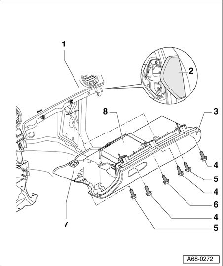 - Remove three bolts - 4 - in recesses at top of glove compartment - 3 -.