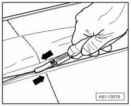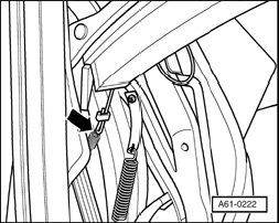 - Disengage tensioning cable from spring - arrow - and pull through eyelet on rear end of roof guide and forward.