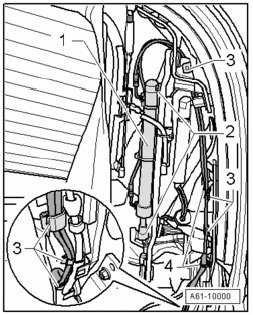 - Carefully remove convertible top switch unit from bolting point mounts. Remove main hydraulic cylinder securing pins - 2 -.