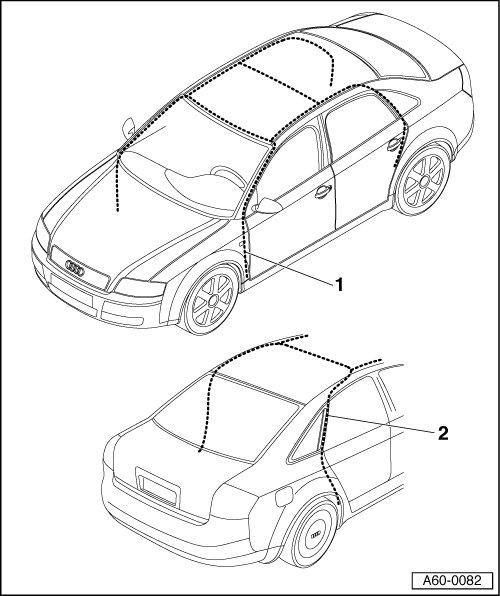 • Front water drain hoses - 1 - are routed in A-pillar and end between door and A-pillar. Cleaning is performed at cut out for sunroof.