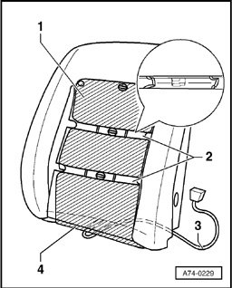 - Align heating elements - 1 - on the backrest cushion, remove the protective film and bond the heating elements firmly onto the padded surfaces.
