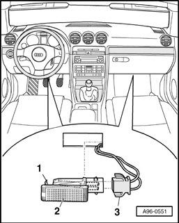 - Using a flat screwdriver, press in retaining tab -1- and pry out footwell light -2-.