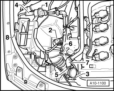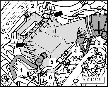 - Remove air intake hose - 1 - between turbocharger and air cleaner housing.
