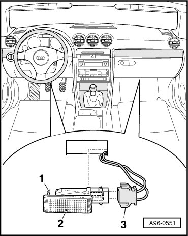 - Using a flat screwdriver, press in retaining tab - 1 - and pry out footwell lamp - 2 -.
