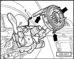 - Carefully release locking tabs - arrows - and pull self-cancelling ring with slip ring off steering column switch.