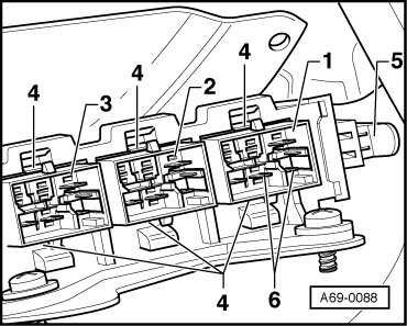 - Remove cable - 4 - for belt fasten sensor from sockets 5 and 6 and on the driver's side (in certain countries), the cable - 4 - for the switch in safety belt latch socket 1 and 2 as well.