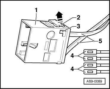 - Using a screwdriver, pry out retaining hooks - 4 - on red connector housing - 1 -.
