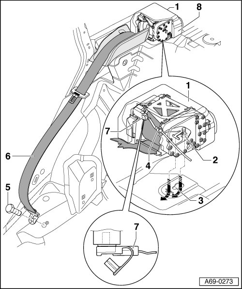 - Loosen bolt - 5 - on outer seat anchorage point (eyes on end of belt).