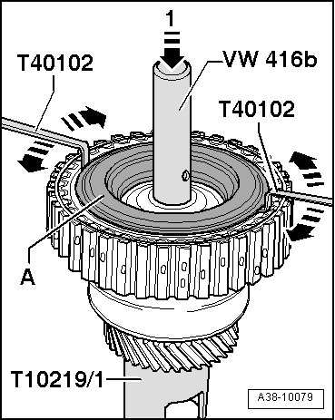 - A second technician must push thrust plate - A - down to stop - arrow 1 - with Tube (VW 416 B).