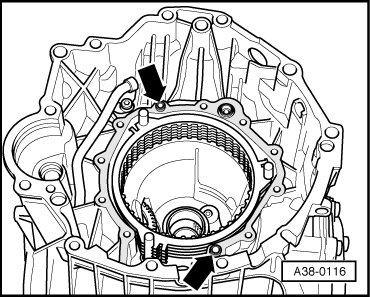 - Check whether bushings - arrows - for centering the flange cover on the transmission housing are installed and seated securely.