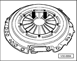 - Check that wire ring in pressure plate - arrow - is not damaged. Replace pressure plate if wire ring is broken.
