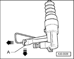 Pressing master cylinder operating rod into retaining clip - A - (in direction of - arrow -).