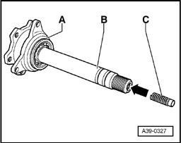 ^ While sliding in the flange shaft, make sure that spring -C- remains in the flange shaft and does not fall into transmission.
