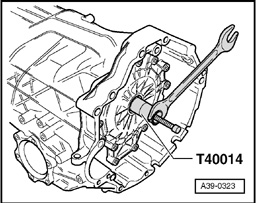 - Rotate seal ring extractor T40014 by hand into shaft seal until tool has a good hold in the shaft seal. Then tighten puller with an open-end wrench.