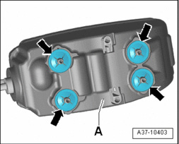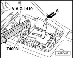 - Press selector shaft lever -A- on transmission completely toward rear -arrow- until parking lock engages.