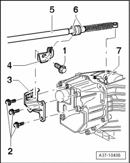 - Tightly bolt selector lever cable -5- to support bracket -4-, tighten lock nuts -6-.