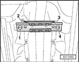 - Remove rear cross member for vehicle floor, remove bolts - 1 through 4 - to do so.