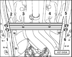 - Remove bolts - 1 through 6 - and remove front cross member for vehicle floor.
