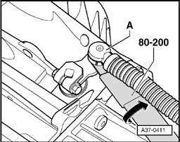 - Using pry lever 80-200, press selector lever cable -A- from lever for selector shaft -arrow-.
