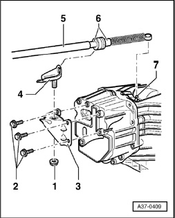 - Check whether selector lever is in position "P", then press ball socket of selector lever cable -5- carefully onto lever for selector shaft -7-.
