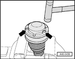 - Using bolts - arrows -, align CV joint boot with cap in relation to bolt holes.