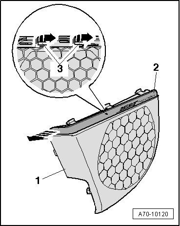 - Carefully slide trim molding - 2 - in - direction of arrow - off speaker trim - 1 -.
