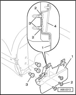 - Remove mounting bolts for wheel housing liner - 4 - in area of wheel spoiler - 1 -.