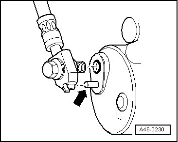 - Make sure that the groove in the banjo fitting of the brake hose is inserted onto the locating tab - arrow -.