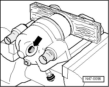 Place a wooden board into the recess of the caliper housing so it is not damaged.