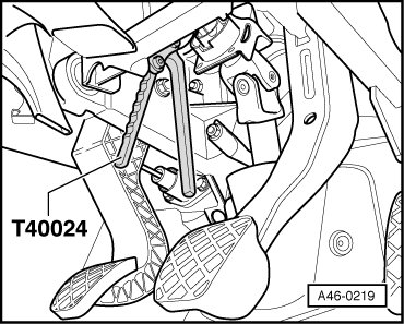 - Guide in the (T40024) and press together, while pulling brake pedal toward the driver seat. (The brake pedal will thereby be pulled off the ball head of the push rod.)
