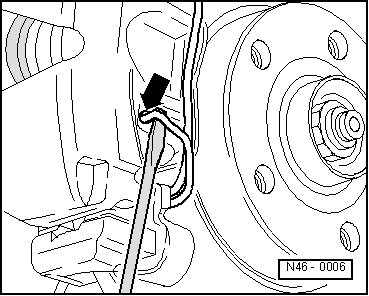 - Using screwdriver, pry off brake pad retaining spring from brake caliper housing - arrow - and remove.