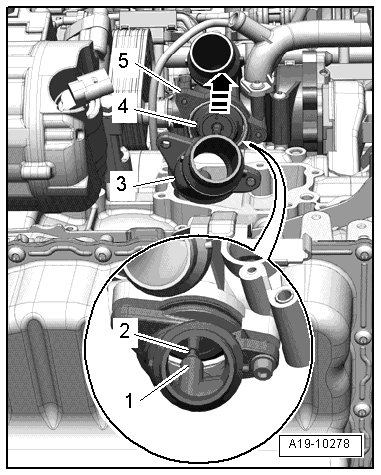 - Install the thermostat - 4 - into the housing - 5 - for the coolant pump and move it slightly forward - arrow -.