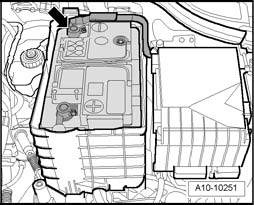 - With the ignition switched off, disconnect the ground wire -arrow- on the battery.