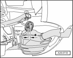 - Push the exhaust system far enough forward - arrow - so that the tension at the retaining loop at the rear muffler is - a - = 15 to 17 mm.