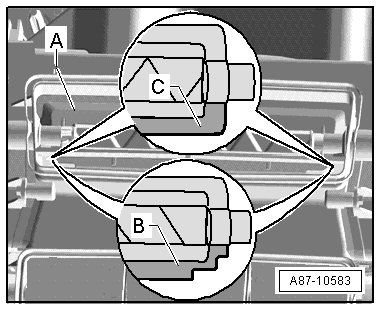 • Beginning November 2007, an air distribution housing for automatic A/C with a door - A - (in the air outlet to the defroster vents in the instrument panel) without a side cut-out - C - is gradually being installed. Prior to the introduction of the door without a side cut-out - C -, the Climatronic control module (J255) was revised (with the deletion of the Airflow door motor (V71) in June 2007). Refer to Electronic Parts Catalog (ETKA).