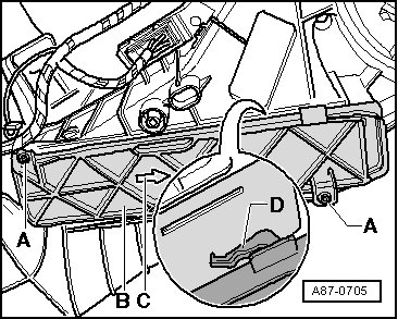 - Remove screw clips - A - (different versions - C - and - D -) and remove insulation mat - B -.