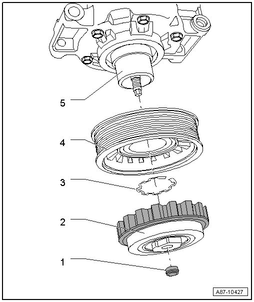 • Belt Pulley, removing and installing, refer to => [ Belt Pulley, Denso Version 3 ] Belt Pulley, Denso Version 3.