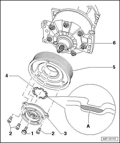 If drive plate has already been replaced once in customer service and was bonded at that time using sealing compound D 154 102 A1, it may be joined so securely to the compressor shaft that it can no longer be pressed off. Refer to => [ Belt Pulley, Zexel/Valeo ] Belt Pulley, Zexel/Valeo, in this case the entire compressor must be replaced.