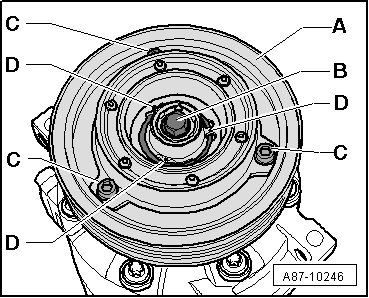 If drive plate overload protection - D - has triggered, the belt pulley turns freely without driving the A/C compressor. Check the A/C compressor for freedom of movement by turning at bolt - B -, replace a A/C compressor with belt pulley that turns with resistance. If compressor moves freely, in this case remove bolts - C - and remove drive plate. Then hold drive plate hub firmly in place using pliers to loosen bolt - B -.