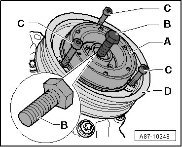 If drive plate - A - has bonded to A/C compressor shaft, install three long bolts - C - in belt pulley - D - through holes of drive plate - A - and then press off drive plate - A - with a convention bolt - B - (bolt with an M8 thread that is flat in the front and has a minimum rigidity class of 10.9). While doing this, hold belt pulley - D - firmly in place using a conventional band wrench (with webbed band).
