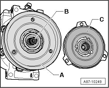 - Check the splines on the drive plate - C -. Replace the drive plate if the splines are showing wear.