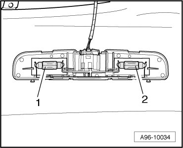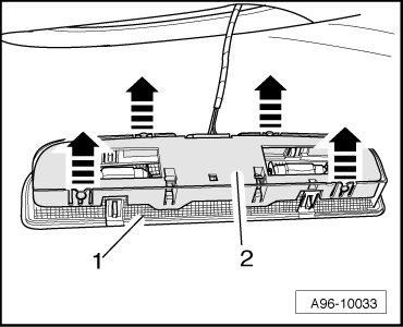 - Carefully pull diffusion lens - 1 - for interior lamp out of socket - 2 - - arrows -.