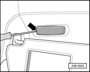 - Using a flat head screwdriver, carefully pry makeup mirror lamp out at opening - arrow -.